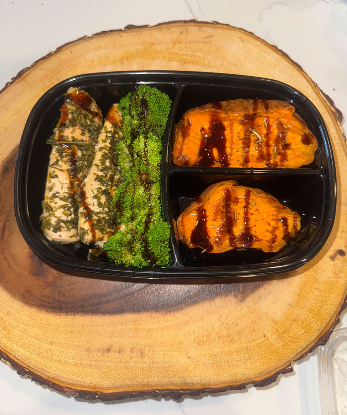 Delight in a gourmet, nutrient-packed meal crafted with 100% organic ingredients. Our tender fish fillet is pan-finished in a classic Meunière sauce, made with fresh lemon, parsley, and garlic for a light, zesty flavor that enhances every bite. Paired with oven-baked sweet potatoes, rich in natural sweetness and fiber, and crisp steamed broccoli loaded with vitamins and antioxidants, this dish is the perfect balance of flavor and nutrition.