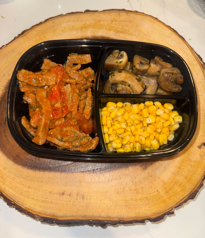 Experience bold, vibrant flavors with our 100% organic Orozco-style beef, finished in a zesty lemon sauce and paired with fresh sliced tomatoes for a bright, savory touch. Served with sweet organic corn and tender garlic mushrooms, this dish delivers the perfect balance of lean protein, wholesome vegetables, and rich Mediterranean-inspired flavor.